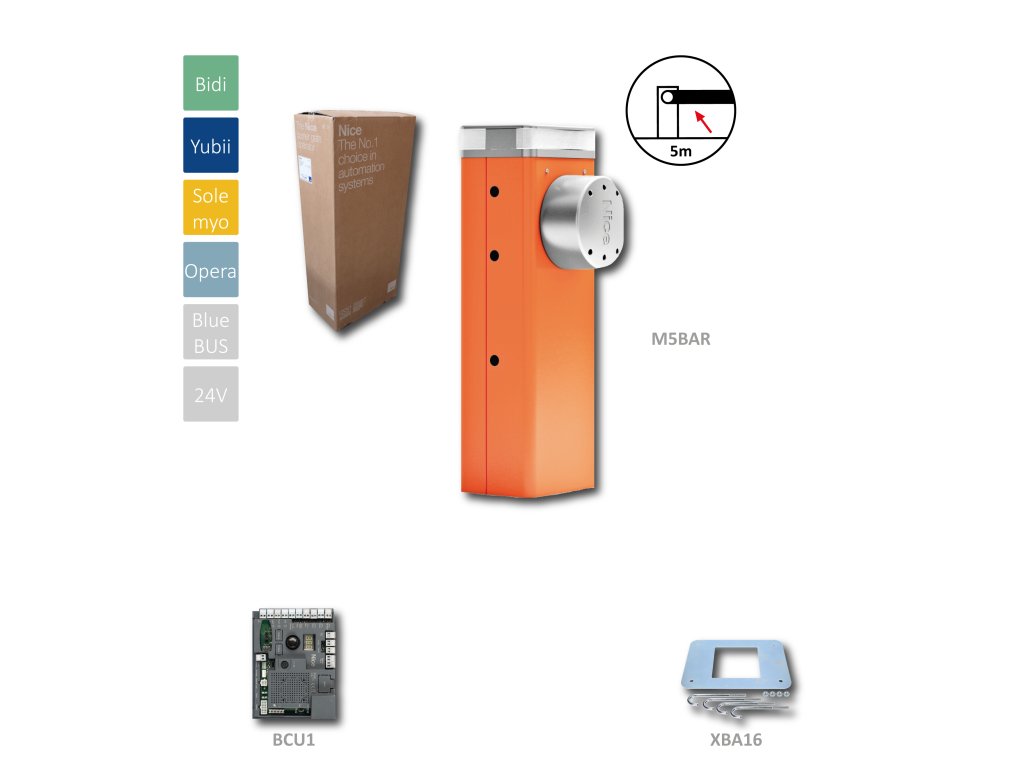 Automatická závora do 5 m průjezdu, motor 24 V, 150 W, 200 Nm, s elektronikou XBA3R10 (SPBCU1), 1x kotevní deska, bez ramena Systém s elektromechanickou závorou pro kontrolu silničních vjezdů Motor 24 Vdc se zabudovanou řídicí jednotkou. Model M5BAR pro ramena do 5m. Modulární: praktické skládání ramen pomocí hliníkové prodlužovací spojky. Možnost ovládání provozu dvou protilehlých automatických závor v inteligentním režimu díky funkci „master/slave“. Sila a spolehlivost: mohutná ocelová konstrukce, nové vyvažovací pružiny s vysokou pevností, zaručující až 1.000.000 pracovních cyklů, rameno s elipsovitým průřezem a vysokou odolností vůči nárazům větru. Volitelné příslušenství signalizační lampa zabudovaná do krytu. Kontrola pohybu enkodérem a elektromagnetickým koncovým spínačem. Větší komfort při programování a servisu: oddělené přihrádky pro elektroniku a mechaniku chrání vnitřní části před případným poškození a nebezpečím. Rychlý a snadný přístup k řídicí jednotce, která je umístěná v horní části skříně závory. Větší spolehlivost a bezpečnost: detekce překážek a sledování odběru proudu motoru během pohybu ramena. Úspora energie: když není systém v provozu, přejde kvůli snížení odběru do stavu stand-by. Žádný black out: provoz i během výpadku dodávky elektrické energie díky volitelné záložní baterii uložené pod řídicí jednotkou. Bočné odblokování s trojhranným klíčem Nice, možnost montáže na obě strany.Doplňkové parametry