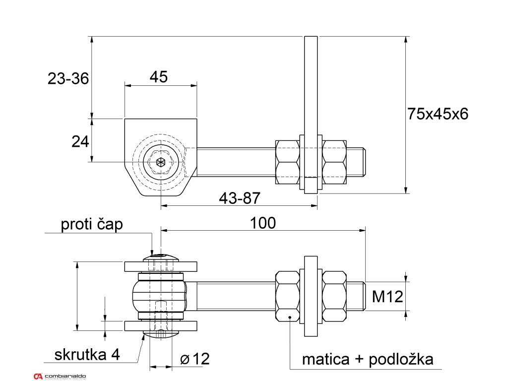 Regulovateľný, navárací bočný záves-pant, závit M12 od popredného talianského výrobcu Combi Arialdo. Povrchová úprava- pozink, 2x časť v tvare D /prizvára sa na krídlo brány/ a časť v tvare I /prizvára sa na stĺp/ - bez povrcovej úpravy. Použitie pre ľahké brány. Počet kusů v balení - 10.