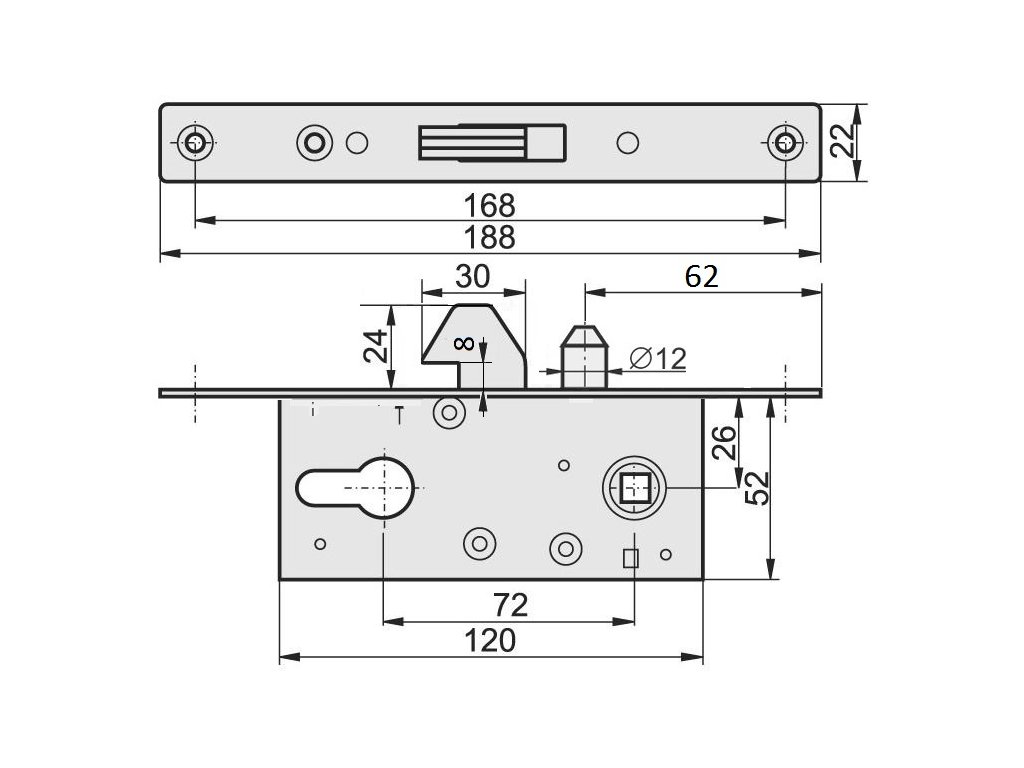 Hákový zámek na posuvnou bránu, rozteč 72 mm + VL60