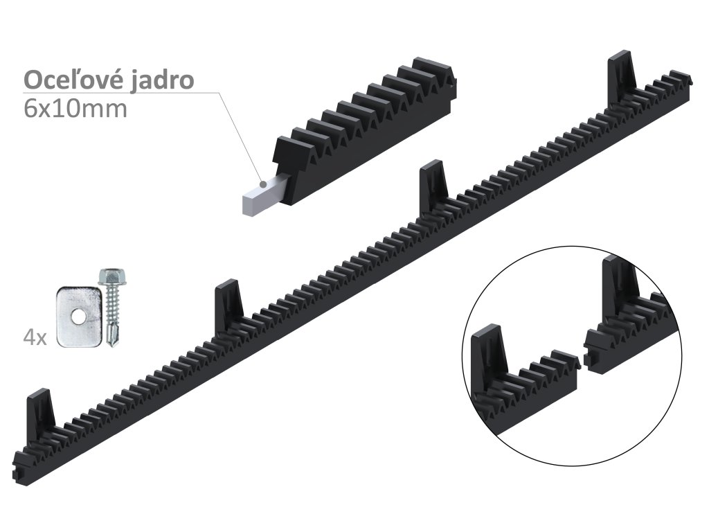 Hřeben nylon-kov L-1000 mm, 26x 19mm, 400 kg 4x úchyt se šroubky, Fe jádro 6x10mm