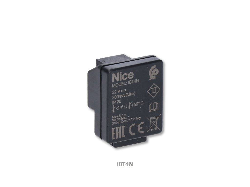 IBT4N - rozhraní pro připojení OVIEW a řídicí jednotky SPY IBT4N je rozhraní, které umožňuje připojení programovací jednotky Oview k řídící jednotce s programovým konektorem IBT4N IBT4N se aktivuje pouze tehdy, když je připojen k řídící jednotce prostřednictvím konektoru. pro pohony: SPY550, SPY650, SPY800, SPIN11, SPIN23, WINGO3524 (jednotka MC424L), RB400, RB600, RD400 Před připojením zařízení IBT4N odpojte napájení od řídící jednotky. U nově kupovaných programátorů OVIEW je už IBT4N přibalen.Doplňkové parametry