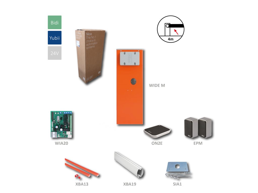 KIT-automatická závora do 4m (24V, 300W, 140Nm) s elektronikou WIA20R10 (integrovaný přijímač), 1x SIA1, 1x XBA19, 1x XBA13, 1x ON2E, 1pár EPM Systém s elektromechanickou závorou pro kontrolu silničních vjezdů. Motor 24 Vdc se zabudovanou řídicí jednotkou. Nastavitelná rychlost a funkce proti sevření. Dvě verze skříně, z pozinkované oceli s lakovaným povrchem, nebo z nerezu (AISI 304) ve třech velikostech pro ramena do 4 metrů. Větší komfort při programování a servisu: Jediná řídicí jednotka pro všechny verze, umístěná v horní části skříně závory. Široká přední dvířka umožňují rychlý a pohodlný přístup. Zesilněný držák motoru usnadňuje manipulaci. Maximální bezpečnost: zabezpečení proti přivření jak při otevírání, tak při zavírání závory; vnitřní držáky fotobuněk ve skříni závory nepřesahují ven a nejsou vidět. Nastavitelná rychlost: elektronicky od 3,5“ (Wide M) do 5“ (Wide L) pro nastavení minimální doby otevírání. Sila, spolehlivost a jednoduchost montáže: Rameno s elipsovým průřezem je lehčí a odolnější vůči poryvům větru. Profil usnadňuje a urychluje montáž příslušenství. Volitelné příslušenství – vylamovací úchyt pro ochranu závory v případě nárazu. Univerzální montáž ramena, napravo nebo nalevo. Jednoduché vyvážení díky praktickému mechanismu pro seřízení napnutí pružiny. Žádný black out: provoz zajištěn i během výpadku dodávky elektrické energie díky volitelné záložní baterii PS234, zabudovatelné do řídicí jednotky. Odblokování trojhranným klíčem Nice, mechanismus chráněný před povětrnostními vlivy. Nice Wide System installation at a glance from Nice Group on Vimeo.Doplňkové parametry