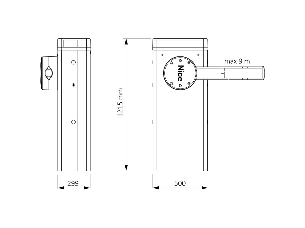 KIT - automatická závora do 9 m (motor 24 V, 160 W, 400 Nm) s elektronikou BCU1 (XBA3R10), 1x XBA17, 1x XBA14, 1x XBA5, 1x XBA9, 2x XBA13, 1x OXIBD, 1x ON2E, 1pár EPMB, 1x XBA7 Systém s elektromechanickou závorou pro kontrolu silničních vjezdů. Motor 24 Vdc se zabudovanou řídicí jednotkou. Silná a rychlá, pro ramena do 9m. Modulární: praktické skládání ramen pomocí hliníkové prodlužovací spojky. Možnost ovládání provozu dvou protilehlých automatických závor v inteligentním režimu díky funkci „master/slave“. Sila a spolehlivost: mohutná ocelová konstrukce, nové vyvažovací pružiny s vysokou pevností, zaručující až 2.000.000 pracovních cyklů, rameno s elipsovitým průřezem a vysokou odolností vůči nárazům větru. Volitelné příslušenství signalizační lampa zabudovaná do krytu. Kontrola pohybu enkodérem a elektromagnetickým koncovým spínačem. Větší komfort při programování a servisu: oddělené přihrádky pro elektroniku a mechaniku chrání vnitřní části před případným poškození a nebezpečím. Rychlý a snadný přístup k řídicí jednotce, která je umístěná v horní části skříně závory. Větší spolehlivost a bezpečnost: detekce překážek a sledování odběru proudu motoru během pohybu ramena. Úspora energie: když není systém v provozu, přejde kvůli snížení odběru do stavu stand-by. Žádný black out: fungování i během výpadku dodávky elektrické energie díky volitelné záložní baterii uložené pod řídicí jednotkou. Bočné odblokování s trojhranným klíčem Nice, možnost montáže na obě strany.Doplňkové parametry