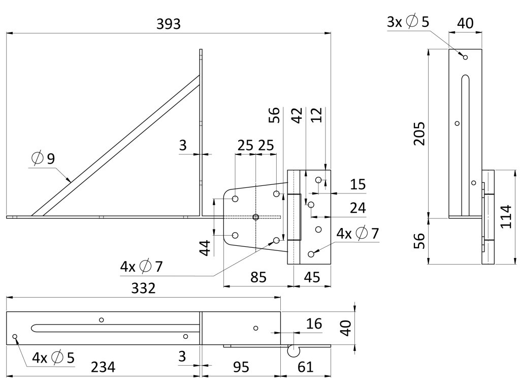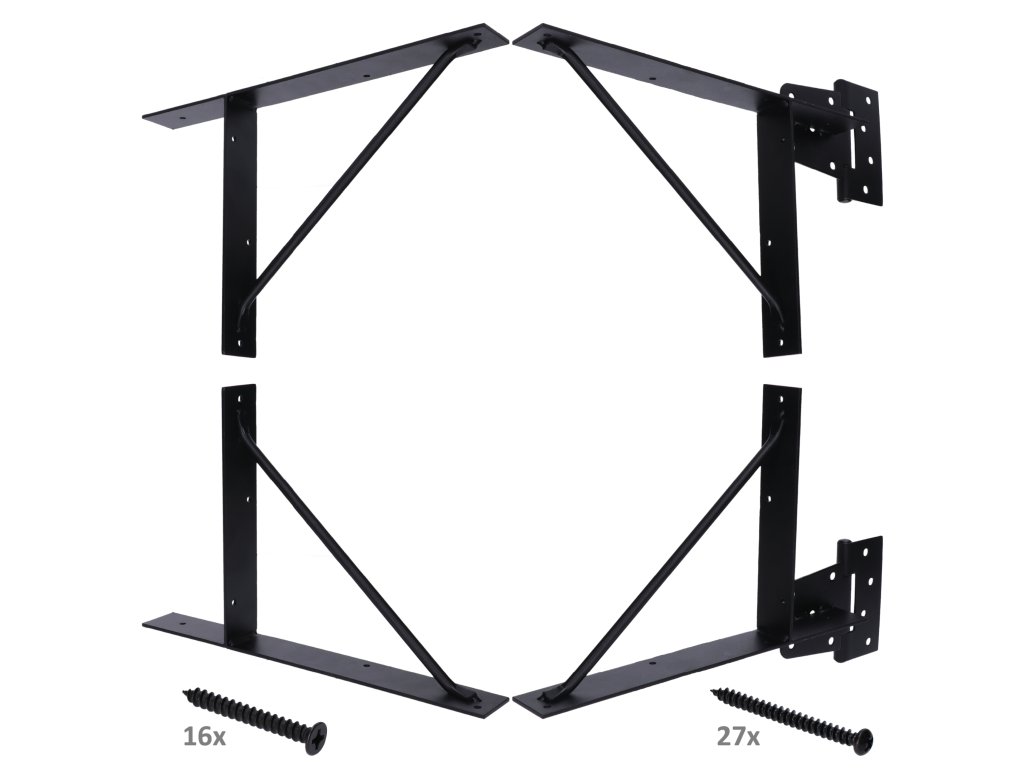 Obsah balení: - 2 x Rohová výztuž RAL9005 matná - 2 x Rohová výztuž se závěsem RAL9005 matná - 27 x Šrouby DIN-7981 4,8x50 RAL9005 matná (pro uchycení hranolů na výztuž) - 16 x Šrouby DIN-7982 5,7x45 RAL9005 matná (pro uchycení zavěsů na sloup)