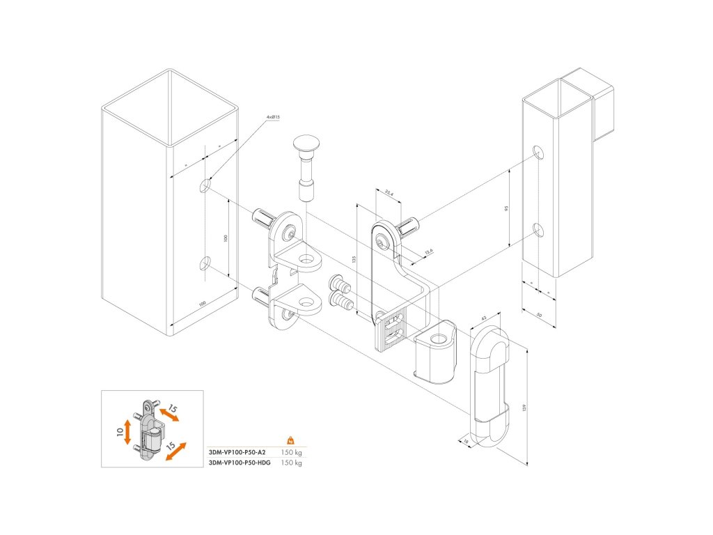 Nerezový 180° otevíratelný závěs pro hliníková/kovová vrata nastavitelný ve třech směrech. Pomocí regulace závěsu docílíte souběžnosti křídel (například při vyosení sloupku vlivem mrazu). Závěs umožňuje regulaci 10mm na šířku (X), 10mm na výšku (Y), 15mm na hloubku (Z). 180° otevíratelný závěs Univerzální pro pravé/levé křídlo Nastavitelný: 10mm na šířku (X), 10mm na výšku (Y), 15mm na hloubku (Z) Zvýšená ochrana (ANTIVANDAL provedení), u zavřených vrat nelze manipulovat se závěsným šroubem s okem. Objímka, osa a kryt závěsu vyrobeného z nerezavějící oceli Rychlá montáž upevňovacími šrouby LOCINOX® QUICK-FIX z nerezavějící oceli (součást balení) Nosnost 150kg/pár (75kg/kus) Rozměry – příloha Obsah balení: 1 PÁR - LOCINOX® 3DM-VP100-P50-A2 4 KS - upevňovací šrouby LOCINOX® QUICK-FIXDoplňkové parametry