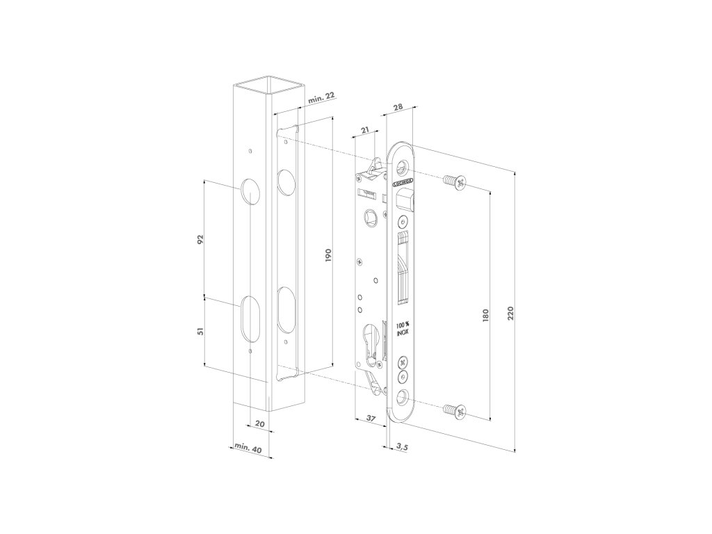 LOCINOX® FORTYLOCK zadlabávací zámek pro křídlové vrata, rozteč 92 mm, zádlab 37 mm, pro profil 40 mm a více