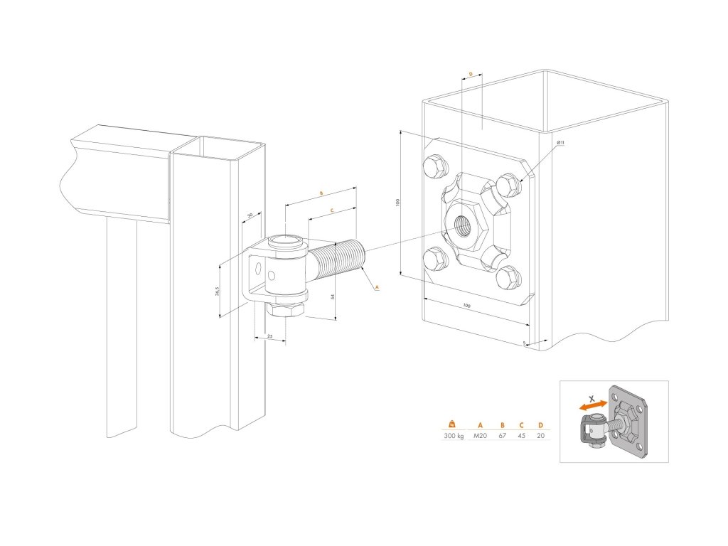 Pant M20 otevíratelný 90° s montážní plotnou 100 x 100 mm. Zvýšená ochrana ANTIVANDAL provedení (u zavřených vrat nelze manipulovat se závěsným šroubem a okem). Nastavitelný 27 mm na šířku (X). Otevíratelný 90° Závit M20 Nastavitelný: 27 mm na šířku (X) Univerzální pro pravé / levé křídlo Zvýšená ochrana (ANTIVANDAL provedení). Žárově pozinkovaný (navařovatelná část bez povrchové úpravy) Nosnost 300 kg/pár (150 kg/kus) Obsah balení: 1 PÁR - LOCINOX® G90WP-B-M20-67Doplňkové parametry
