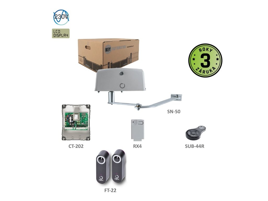 MEWAKIT3 sada pákového pohonu pro jednokřídlou bránu do 4 m/kř., 1x SN-50, 1x CT-202, 1x RX4, 1 pár FT-22, 1x SUB-44R Až do 300 mm zapuštění křídla brány. Volitelné odblokování z venku! Verze 230 V je kompatibilní s řídicí jednotkou CT202.