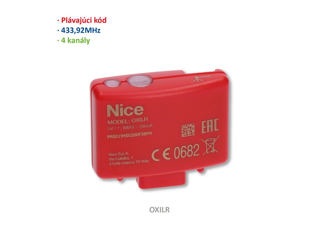 Přijímač zásuvný, 4 kanálový, 433,92 MHz, obousměrný, s dlouhým dosahem LoRa, paměť na 1024 obousměrných LoRa vysílačů, konektor SM, signalizace LED Obousměrný přijímač se slotem vybaven technologií LoRa®. OXILR je kompatibilní se všemi řídicími jednotkami Nice, které jsou vybaveny konektrorem SM, a proto je možné vybavit obousměrnou technlogií s dlouhým dosahem i starší nainstalované automatizační techniky Nice. Ergonomický design: snadno přístupný a praktický konektor pro připojení antény, programovací tlačítko a LED dioda. Maximální flexibilita: do paměti lze uložit až 1024 obousměrných dálkových ovladačů s technologií LoRa®.