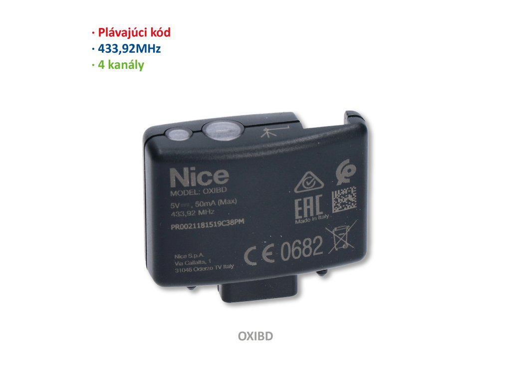 Přijímač zásuvný, 4-kanálový, obousměrný, 433,92 MHz, paměť na 750 obousměrných nebo 1024 standardních vysílačů Společnost Nice již více než 25 let zkoumá potřeby zákazníků a poskytuje nejkvalitnější a spolehlivé řídicí systémy. Posledním příkladem je inteligentní obousměrný dálkový ovladač Era One BiDi, který poskytuje ovládání, pohodlí a bezpečnost doma díky možnosti kdykoliv zkontrolovat stav vstupních nebo garážových vrat. Era One BiDi pracuje s novými rádiovými moduly OXI BiDi, díky kterým může nejen posílat příkazy do ovladačů, ale také přijímat zpětnou vazbu. Například po stisknutí tlačítka na otevření nebo zavření brány na dálkovém ovladači se rozsvítí zelená LED dioda v rohu dálkového ovladače, což potvrzuje, že příkaz byl správně přijat automatizací brány. Po stisknutí tlačítka "i" se zase rozsvítí zelená LED, pokud je brána otevřená, červená, pokud je zavřená, nebo oranžová, pokud je brána částečně otevřená nebo se pohybuje. Nízká kapacita baterie nebo jakékoliv chyby v komunikaci nebo automatizaci jsou signalizovány vibrací celého dálkového ovladače. Použitá technologie NFC, známá z bezkontaktních platebních karet, umožňuje přístup k dalším funkcím dálkového ovládání. Po umístění smartphonu vedle dálkového ovladače Era One BiDi umožňuje aplikace Nice například čtení stavu nabití baterie v dálkovém ovladači. Nové řešení může také pracovat se sítí vytvořenou jinými zařízeními Nice v okolí. Díky tomu je možné bránu kontrolovat a ovládat i z větší vzdálenosti, například z druhé strany pozemku. Výhodou nového řešení je i šifrování komunikace zaručující nejvyšší úroveň bezpečnosti a zvýšenou odolnost proti rádiovému rušení. Moderní obousměrný rádiový protokol je také téměř třicetkrát rychlejší než v předchozích verzích pilotů. Nový systém je kompatibilní se všemi motory Nice pro vchodové brány a garážová vrata pomocí modulárního vysílače OXI. Chcete-li připojit a spustit dálkové ovládání, jednoduše otevřete ovládací panel a vyměňte modul vysílače OXI za OXIBD. OXIBD rádiový přijímač s oboustrannou komunikací jsou kompatibilní s jednosměrnými typy rádiového kódování: O-Code, Flo, Flor, TTS, Smilo a s vysílačkami BD, které podporují oboustrannou komunikaci. Zejména typy kódování O-Code a BD umožňují využití pokročilých funkcí, které jsou výhradní součástí systému NICE OPERA. Přijímač je určen pro řídící jednotky s konektorem SM. Možnost dostat «odpověď» po odeslání příkazu. Možnost zjistit stav vaší brány - signalizace pomocí barvy diody: červená - zavřená oranžová - částečně otevřená zelená - otevřená Směrování signálu - opakovač mezi přijímači (max 10). Možnost vymazání jednoho vysílače. Kapacita 750 vysílaček BiDi nebo 1024 standardních vysílaček, (cca 900 vysílaček při používání vysílaček obou typů)Doplňkové parametry