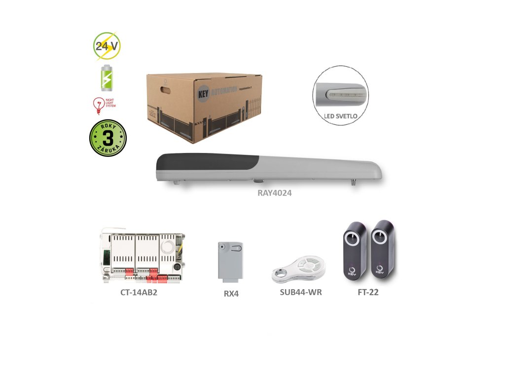 RAYKIT pro jednokřídlovou bránu do 4 m/křídlo, 1x RAY4024 (24V, 120W, 2000N), 1x SUB-44WR, 1x CT-14AB2, 1xRX4, 1 pár FT-22