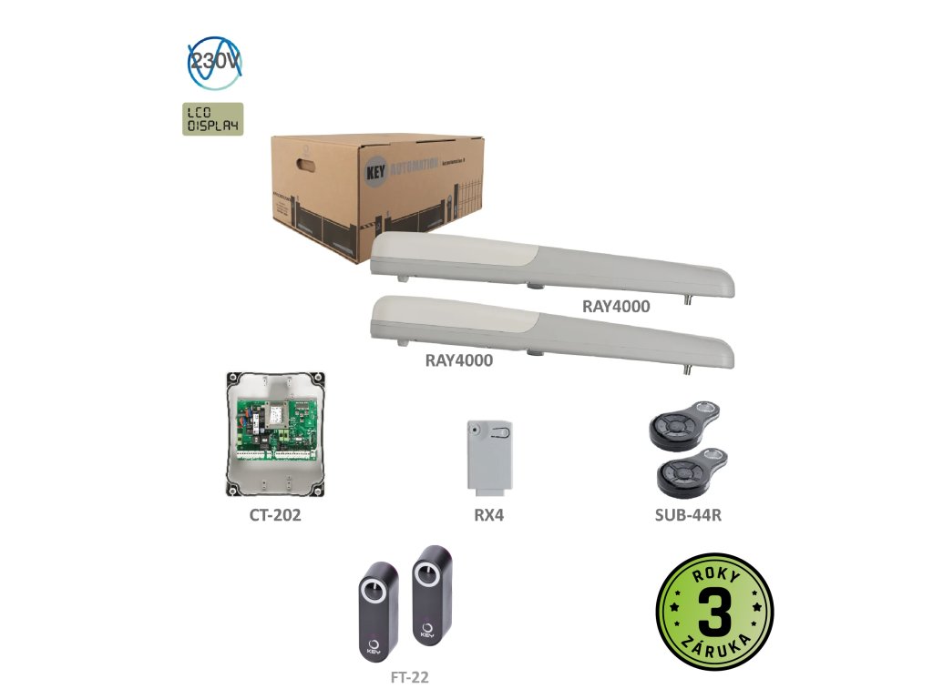 900KRAY42KS - RAY 42KR KIT pro dvoukřídlou bránu do 4 m/kř., 2x pohon RAY40-230V, 280W, 2000N, 2x SUB-44R, 1x CT-202, 1x RX4, 1pár FT-32