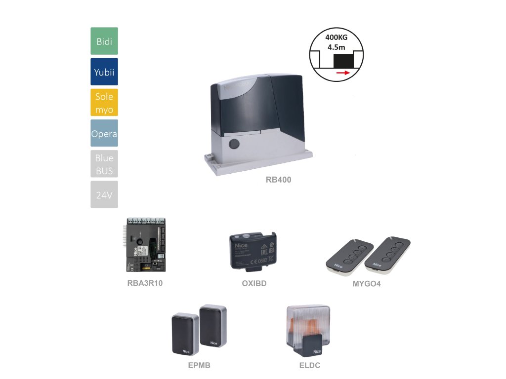 POZOR zde najdete odkaz na nový Robus400 - nástupce dnešního, který se pomalu doprodává. V odkazu pak najdete všechny výhody které nové Robusy přinášejí. Vyzkoušejte si ho! Budete spokojeni. RB400BDKCE sada pro posuvnou bránu do 400 kg, 1x RB400 (24 V, 250 W, 400 N), 1x RBA3R10, 2x MYGO4, 1x OXIBD, 1 pár EPMB, 1x ELDC Tato sada obsahuje vše, co potřebujete k automatizaci posuvné brány do 400 kg. Je ideální pro rodinné domy a lehké průmyslové použití. Výhody: Možnost zálohování akumulátorem PS124 a solárním napájením: Zajistí provoz brány i při výpadku napájení. Moderní design: Elegantní a kompaktní pohon, který se hodí k jakémukoli typu brány. Inteligentní řídicí jednotka: Nabízí širokou škálu funkcí a možností nastavení. Vysoká rychlost posuvu: Brána se otevírá a zavírá rychle a plynule. Zpomalení při dojezdu i rozjezdu: Zabezpečuje plynulý a bezpečný pohyb brány. Vysoká bezpečnost provozu: Motor 24V s okamžitou reakcí na překážku. Jednoduchá instalace: Systém BlueBUS umožňuje jednoduché zapojení všech komponentů. Praktická a odolná konstrukce: Pohon je vyroben z hliníku a má epoxidovou povrchovou úpravu. Nouzová baterie PS124 (volitelná), zabudovaná uvnitř pohonu, propojitelná přes pohodlný konektor. Tichý chod: Motor je uložen na ložiskách, takže je velmi tichý. Pokročilý: RB400 je vybaven teplotním senzorem, který přizpůsobuje sílu motoru klimatickým podmínkám a zároveň upravuje tepelnou pojistku. Volba master/slave automaticky synchronizuje i posuvné brány s dmy protiľahlými křídly. Inteligentní: Díky rozlišování překážek a automatickému programování času práce. Autodiagnostika se signalizací prostřednictvím majáku. 8 stupňů programování. Pevný: Základna a odblokování z hliníku litého pod tlakem, s epoxidovým nátěrem. Obsah sady: 1x pohon RB400 (24V, 250W, 400N), 1x řídicí jednotka RBA3R10 2x dálkový ovladač MYGO4 1x rádiový přijímač OXIBD 1 pár fotobuněk EPMB 1x maják ELDC OXIBD rádiový přijímač s oboustrannou komunikací jsou kompatibilní s jednosměrnými typy rádiového kódování: O-Code, Flo, Flor, TTS, Smilo a s vysílačkami BD, které podporují oboustrannou komunikaci. Zejména typy kódování O-Code a BD umožňují využití pokročilých funkcí, které jsou výhradní součástí systému NICE OPERA. Přijímač je určen pro řídící jednotky s konektorem SM. Možnost dostat «odpověď» po odeslání příkazu. Možnost zjistit stav vaší brány - signalizace pomocí barvy diody: červená - zavřená oranžová - částečně otevřená zelená - otevřená Směrování signálu - opakovač mezi přijímači (max 10). Možnost vymazání jednoho vysílače. Kapacita 750 vysílaček BiDi nebo 1024 standardních vysílaček, (cca 900 vysílaček při používání vysílaček obou typů)Doplňkové parametry