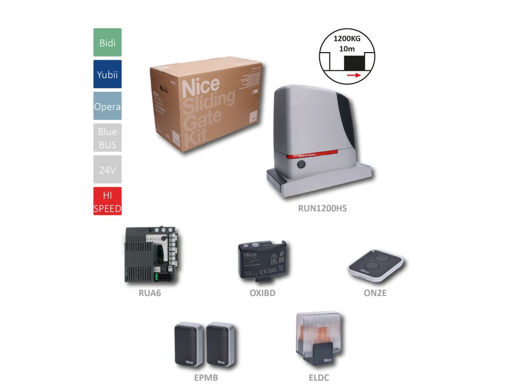 RUN1200 HI-SPEED kit rychlého pohonu pro posuvnou bránu do 1200 kg, 24 V, 700 W, BlueBus, 1x OXIBD, 1x EPMB, 1x ON2E, 1x ELDC, kompatibilní s nabíječkou baterií PS524 a akumulátory N B12-B (2 ks) Výhody: Jednoduchá instalace: systém BlueBUS umožňuje zapojení až 15 zařízení pomocí dvou vodičů. Praktické řešení: řídící jednotka, nouzová baterie (volitelná) a nabíječka jsou zabudované v pohonu. Pokročilé funkce: teplotní senzor, synchronizace dvou bran, detekce překážek, autodiagnostika. Bezpečný provoz: nastavitelné zrychlení a zpomalení, pevná konstrukce. Tichý chod: motor na ložiskách. Další vlastnosti: Verze: s elektromechanickým koncovým spínačem (RUN1500) a s indukčním (RUN1500P) Rychlost: 0,32 m/s Teplotní senzor: přizpůsobuje výkon motoru klimatickým podmienkam Volba master/slave: synchronizace dvou protilehlých bran Autodiagnostika: signalizace poruch 8 stupňů programování: široké možnosti nastavení Pevná konstrukce: hliníková klika odblokování Tichý chod: motor na ložiskách.Doplňkové parametry