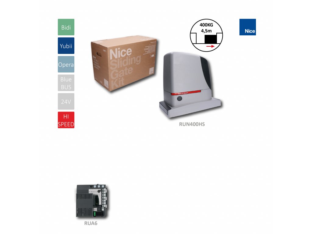 RUN400 HI-SPEED rychlý pohon pro posuvnou bránu do 400 kg, 24 V, rychlost posuvu naprázdno - 70 cm/s, 510W, 340N, elektronika BlueBus, dá se zálohovat pomocí PS524 Vlastnosti: Jednoduchá montáž: Systém BlueBUS umožňuje připojení až 15 ovládacích, bezpečnostních a signalizačních zařízení k řídící jednotce pomocí pouhých dvou vodičů. Bezpečný: Nastavitelné zrychlení na začátku a zpomalení na konci každého pracovního cyklu zajišťuje přesný a spolehlivý provoz. Pokročilý: Pohon je vybaven teplotním čidlem, které přizpůsobuje sílu motoru podle okolních klimatických podmínek. Zároveň upravuje nastavení tepelné pojistky a intenzitu ventilace v závislosti na zaznamenané teplotě. Volba master/slave: Automaticky synchronizuje provoz dvou motorů, čímž umožňuje automatizovat i posuvné brány se dvěma protilehlými křídly. Praktický a funkční: Pohon obsahuje řídící jednotku, nouzovou baterii B12-B a volitelnou nabíječku PS524, které jsou vestavěny uvnitř pohonu a propojitelné pomocí pohodlného konektoru. Tichý: Motor je uložen na ložiskách, čímž je zajištěn tichý chod. Obsah sady RUN400 HS: Pohon RUN400 HS Řídící jednotka RUA6 s integrovaným přijímačem Montážní materiál Technické parametry: Hmotnost brány: do 400 kg Napájení: 24 V Rychlost posuvu naprázdno: 70 cm/s Příkon: 415 W Kroutící moment: 790 Nm Elektronika: BlueBus Zálohování: Pomocí PS524 Výhody: Rychlý a tichý chod Snadná montáž a nastavení Bezpečnostní funkce Možnost zálohování Kompatibilní s širokou škálou příslušenstvíDoplňkové parametry
