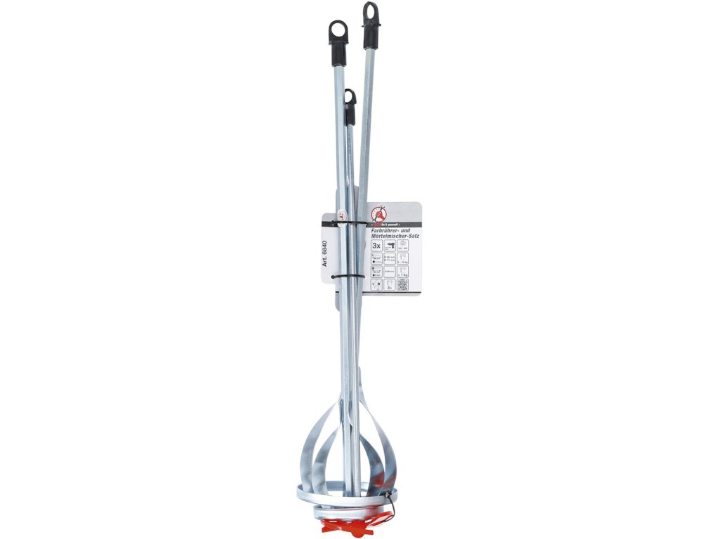 Univerzální sada pro míchání malt a barev s nízkou a vysokou viskozitou. Vlastnosti: Vyrobeno z odolných materiálů pro dlouhou životnost. Ergonomický design pro pohodlné používání. Rychlé a efektivní míchání různých materiálů. Vhodné pro použití s vrtačkou nebo míchačkou. Vhodná pro různé velikosti nádob: Míchadlo na maltu: 5 - 10 kg Míchadlo na barvy: < 1 kg Obsah balení: 1x Míchač na maltu, Ø 60mm, délka 395mm, šestihran 7,7mm 1x Míchač na maltu, Ø 77mm, délka 395mm, šestihran 7,7mm 1x Míchač na barvy s plastovou hlavou (PVC), Ø 60mm, délka 355mm, kulatá tyč 6mmDoplňkové parametry