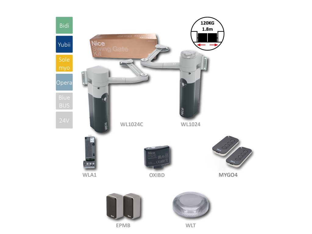 Sada pro dvoukřídlou bránu do 1,8 m / křídlo, 1x WL1024, 1x 1024C (24V, 120W, 100 nm), 1x WLA1, 2x MYGO4, 1x OXIBD, 1 pár EPMB, 1x WLT Vlastnosti: Nereverzní elektromechanický motor 24 Vdc s kloubovým ramenem: Zajišťuje plynulý a tichý chod branky. Ultra tenký design: Vhodný pro úzké sloupky s šířkou pouhých 8 cm. Bezpečná provoz: Nereverzní motor a rameno proti přiskřípnutí chrání před zraněním. Praktická montáž: Kloubové rameno umožňuje montáž i v náročných podmínkách. Rychlé otevírání a zavírání: Brána se otevírá nebo zavírá za pouhých 7 sekund (v optimálních podmínkách). Pohodlné ovládání: Zabudovaný LED maják osvětluje prostor a umožňuje manuální odblokování motoru. Nepřetržitá provoz: Volitelná nouzová baterie (PS424) zajistí fungování i při výpadku proudu. Inteligentní řídící jednotka: Nabízí široké možnosti programování a diagnostiky. Kompatibilita: Systém je kompatibilní s různými typy dálkových ovladačů a bezpečnostních zařízení. Výhody: Jednoduchá instalace a údržba Tichý a plynulý chod Vysoká úroveň bezpečnosti Široké možnosti programování Kompatibilita s různými příslušenstvím OXIBD je rádiový přijímač s obousměrnou komunikací, který je kompatibilní s různými typy dálkových ovladačů. Vlastnosti: Kompatibilita: Podporuje jednosměrné kódování O-Code, Flo, Flor, TTS a Smilo a obousměrné kódování BD. Pokročilé funkce: Umožňuje využití pokročilých funkcí systému NICE OPERA, zejména s kódováním O-Code a BD. Obousměrná komunikace: Poskytuje zpětnou vazbu o stavu brány (zavřená, otevřená, částečně otevřená). Signalizace LED diodou: Různé barvy LED diody indikují stav brány. Možnost opakování signálu: Funguje jako opakovač mezi přijímači (max. 10). Vysoká kapacita: Umožňuje naprogramovat až 750 obousměrných nebo 1024 standardních dálkových ovladačů. Výhody: Kompatibilita s různými typy dálkových ovladačů Možnost využití pokročilých funkcí Obousměrná komunikace pro zpětnou vazbu o stavu brány Jednoduchá instalace a programování Vysoká kapacita pro naprogramování více dálkových ovladačůDoplňkové parametry