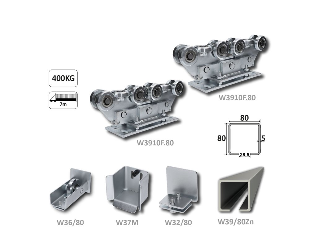 Samonosný systém 80x80x5 mm pro posuvné brány do 400 kg / 7 m otvor (W39/80Zn 6 m pozinkovaný profil, 2x W3910F.80, 1x W36/80, 1x W37M, 1x W32/80)