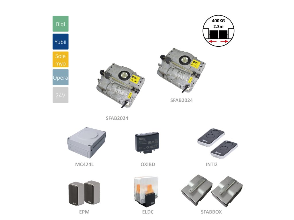 SFAB2024BDKCE podzemní sada pro dvoukřídlou bránu do 2,3 m / křídlo, 2x SFAB2024 (24 V, 120 W, 250 Nm), 1x MC424L, 2x INTI2, 1x OXIBD, 1 pár EPM,1x ELDC, 2x SFABBOX Vlastnosti: Podzemní instalace: Pohony jsou umístěny pod zemí, takže jsou nenápadné a neruší vzhled brány. Tichý chod: Pohony jsou tiché a neruší tak okolí. Spolehlivost: Pohony jsou vyrobeny z kvalitních materiálů a jsou odolné vůči povětrnostním vlivům. Bezpečnost: Sada je vybavena bezpečnostními prvky, jako jsou fotobunky a bezpečnostní lišta. Jednoduché použití: Pohony se jednoduše ovládají dálkovým ovladačem.Doplňkové parametry