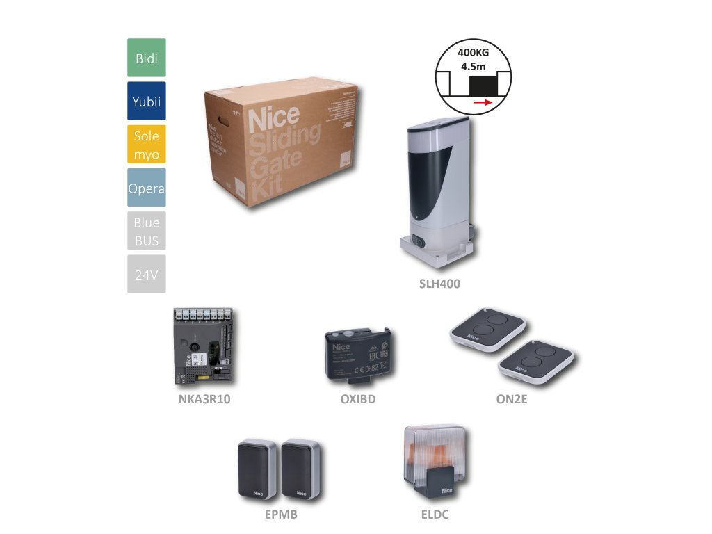 SLIGHT sada pohonu pro posuvnou bránu do 400 kg s LED osvětlením, motor 24 V, 250 W, 6 Nm, příslušenství 2x ON2E, 1x EPMB, 1x OXIBD, 1x ELDC Vlastnosti: Kompaktní design: Pohon se zabudovanou řídicí jednotkou a absolutním enkodérem je vertikálně navržen pro snadnou montáž i v omezeném prostoru. Jednoduchá instalace: Systém BlueBUS umožňuje připojení až 15 ovládacích, bezpečnostních a signalizačních zařízení k řídicí jednotce pomocí pouhých dvou vodičů. LED osvětlení: Zabudované LED světlo lze nastavit jako výstražný maják nebo osvětlení prostoru a signalizuje pohyb brány během otevírání a zavírání. Synchronizace motorů: Volba master/slave umožňuje automaticky synchronizovat dva motory pro automatizaci posuvných bran se dvěma protilehlými křídly. Inteligentní funkce: Detekce překážek a automatické programování délky pracovního cyklu. Diagnostika signalizovaná blikáním majáku. Bezpečnost: Nastavitelné zrychlení na začátku a konci každého pracovního cyklu. Zabudovaný absolutní koncový spínač pro snadné a přesné nastavení. Praktické vlastnosti: Řídicí jednotka a záložní baterie PS124 (volitelné příslušenství) se připojují přes konektor. Zabudovaný absolutní koncový spínač: Jednoduché a přesné nastavení díky rychlému načtení během jediného pracovního cyklu s odblokovaným motorem; Žádná konzola nebo jiné příslušenství, které by bylo nutné montovat na ozubený hřeben; Obzvlášť vhodný do zasněženého prostředí. Výhody: Kompaktní a elegantní design Snadná instalace a konfigurace LED osvětlení pro větší bezpečnost a viditelnost Synchronizace motorů pro automatizaci bran se dvěma křídly Inteligentní funkce pro bezpečný a plynulý provoz Praktické vlastnosti pro pohodlné používáníDoplňkové parametry