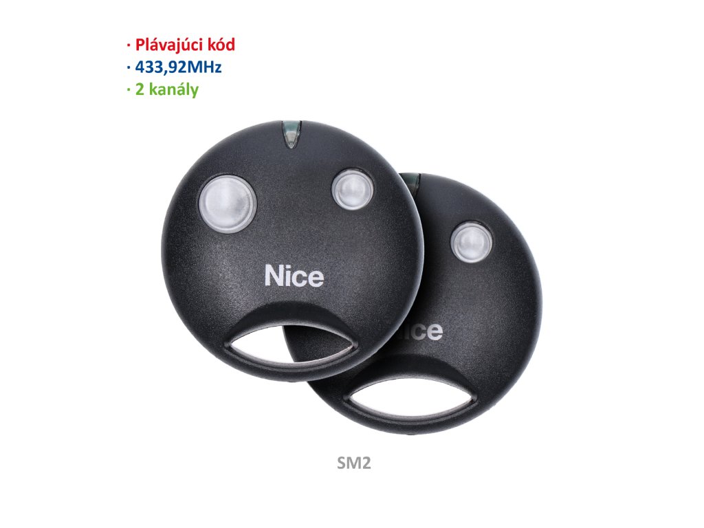 2kanálové dálkové ovládání NICE SMILO pro ovládání automatizací, s plovoucím kódem 433.92Mhz, 2ks v balení VYHOTOVENÍ: černé tělo s kvalitního plastu a tlačítka s průhledného materiálu zaručí dlouhou životnost DOSAH: od 100m do 200m s anténou ABF/ABFKIT na otevřeném prostranství s plovoucím kódem 433,92 MHz KOMUNIKUJE: OXI/OXIBD a OX2 BATERIE: L1028FDoplňkové parametry