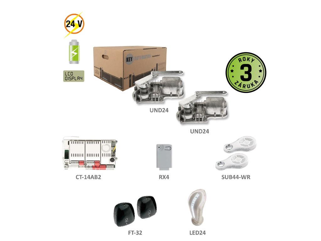 900KUND3024ER - UNDERKIT podzemní pohon pro dvoukřídlou bránu do 3,5m / křídlo, 2x UND24, 1x CT-14A, 1x RX4, 1 pár FT-32, 2x SUB-44WR, 1x LED24 Vlastnosti: Pohony UND24 jsou tiché a spolehlivé s maximálním točivým momentem 250 Nm. Jsou vodotěsné a odolné vůči povětrnostním vlivům. Řídicí jednotka CT-14A umožňuje nastavení různých funkcí, jako je automatické zavírání, brzda, rychlost otevírání a zavírání a bezpečnostní prvky. Fotobuňky FT-32 zajistí bezpečnost průchodu a zabrání bráně v zavření, pokud se v její dráze nachází osoba nebo předmět. Dálkové ovladače SUB-44WR umožňují pohodlné ovládání brány na dálku. Signalizační LED světlo LED24 informuje o stavu brány. Výhody: Estetický vzhled - pohony jsou skryté pod zemí, takže nenarušují vzhled brány. Bezpečnost - fotobuňky a bezpečnostní lišty chrání před zraněním a poškozením. Pohodlní - bránu můžete ovládat na dálku. Spolehlivost - pohony jsou vyrobeny z kvalitních materiálů a jsou odolné vůči povětrnostním vlivům.