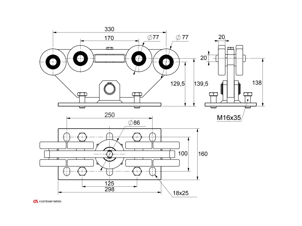 Samonosny systém vozíka od popredného talianského výrobcu Combi Arialdo. Povrchová úprava- pozink. Použitie pre posuvné brány. Kombinácia s kolajnicou C399M/Fe a C399M/Zn.Doplňkové parametry