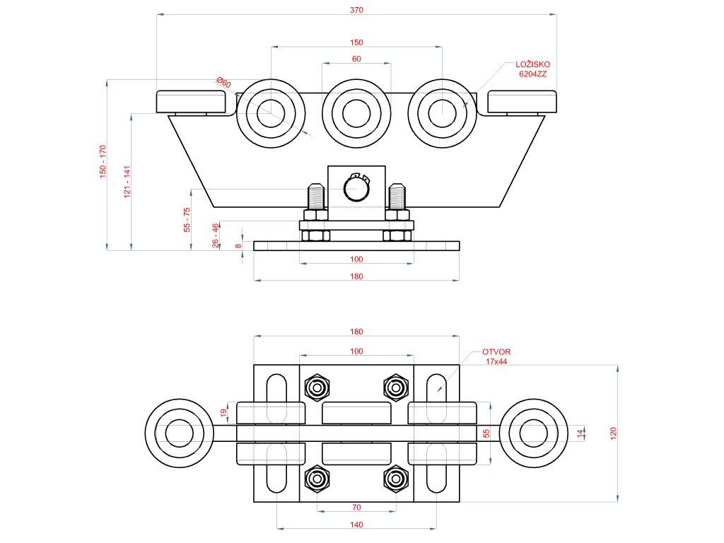 Vozík regulovateľný pre C-profil 70 x 70 x 4 mm, polyamidové kolieska 8 ks, žltý zinok, pre bránu do 300 kg otvor do 5,5 mDoplňkové parametry