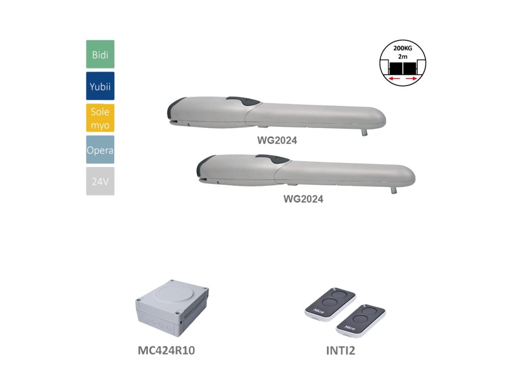 WG2024KCE Sada pro křídlovou bránu do 2m/křídlo, 2x pohon 24V, 85W, 1500N, 2x INTI2, 1x MC424LR30 (vestavěný přijímač) Cca od začátku roku 2026 bude v balení řídicí jednotka MC424LR30 s nižší spotřebou energie v klidovém režimu. Pokud ji budete chtít zálohovat záložním zdrojem N PS124, pak je potřeba dokoupit kabel N CABLA11 (v budoucnosti to bude vyřešeno novým záložním zdrojem N PSS124 kde budou dva propojovací kabely - pro starší i novější typy jednotek). Vlastnosti: Vhodná pro brány s křídly do 2 metrů: Ideální pro rodinné domy, chaty, garáže a firmy. Spolehlivá a tichá: Patentované vnitřní uspořádání a méně pohyblivých částí zajišťují plynulý a tichý chod. Jednoduchá montáž: Elektrické zapojení shora po namontování pohonu usnadňuje instalaci. Pohodlné odblokování: Personalizovaný klíč Nice a standardní zámek umožňují manuální odblokování v případě výpadku proudu. Bezpečnost: Předmontované mechanické koncové dorazy a inteligentní řídicí jednotka s funkcemi jako detekce překážek a automatické uzamčení. Výhody: Pohodlné a bezpečné otevírání a zavírání brány: Už žádné manuální otevírání v nepříznivém počasí. Ovládejte bránu dálkově z auta nebo domu. Zvýšení komfortu a hodnoty vašeho domu: Automatizovaná brána dodá vašemu domu moderní vzhled a zvýší jeho hodnotu. Ochrana před neoprávněným vstupem: Bezpečnostní funkce chrání váš dům před vniknutím nepovolaných osob. Jednoduchá instalace: Zvládne ji i šikovný domácí kutil.Doplňkové parametry