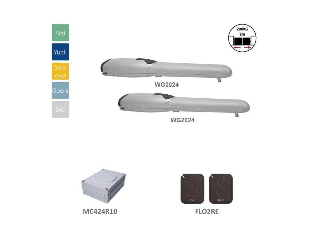WG2024KCE Sada pro křídlovou bránu do 2m/křídlo, 2x pohon 24V, 85W, 1500N, 2x INTI2, 1x MC424R10 (vestavěný přijímač) Vlastnosti: Vhodná pro brány s křídly do 2 metrů: Ideální pro rodinné domy, chaty, garáže a firmy. Spolehlivá a tichá: Patentované vnitřní uspořádání a méně pohyblivých částí zajišťují plynulý a tichý chod. Jednoduchá montáž: Elektrické zapojení shora po namontování pohonu usnadňuje instalaci. Pohodlné odblokování: Personalizovaný klíč Nice a standardní zámek umožňují manuální odblokování v případě výpadku proudu. Bezpečnost: Předmontované mechanické koncové dorazy a inteligentní řídicí jednotka s funkcemi jako detekce překážek a automatické uzamčení. Výhody: Pohodlné a bezpečné otevírání a zavírání brány: Už žádné manuální otevírání v nepříznivém počasí. Ovládejte bránu dálkově z auta nebo domu. Zvýšení komfortu a hodnoty vašeho domu: Automatizovaná brána dodá vašemu domu moderní vzhled a zvýší jeho hodnotu. Ochrana před neoprávněným vstupem: Bezpečnostní funkce chrání váš dům před vniknutím nepovolaných osob. Jednoduchá instalace: Zvládne ji i šikovný domácí kutil.Doplňkové parametry