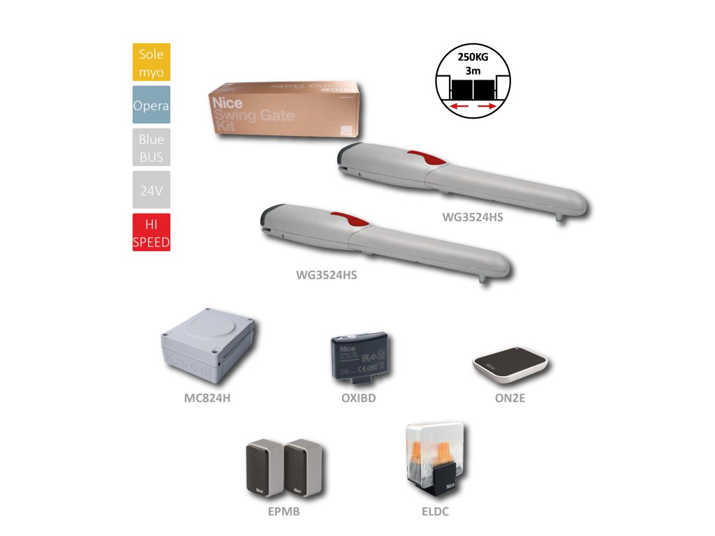 WG3524HS HI-SPEED sada rýchlych pohonov pre dvojkrídlovú bránu do 3m/krídlo, 2x WG3524HS (24V, 120W, 1500N), 1x MC824H, 1x OXIBD, 1x EPMB, 1x ON2E, 1x ELDC pro venkovní montáž. Elektromechanický motor 24 Vdc. Spolehlivost a tichost: patentované vnitřní uspořádání součástek, méně pohyblivých častí Jednoduchost montáže: elektrické zapojení shora, po montáži pohonu Pohodlné odblokování personalizovaným klíčem Nice a standardním zámkem Mechanické koncové dorazy při otevírání jsou předmontované. Řídicí jednotka Moonclever MC424L: jednoduché programování jedním ze tří tlačítek; spojka s pojistkou proti přivření; automatické načtení koncových poloh při otevírání a zavírání; programování délky pauzy; křídlo pro pěší; zpomalení během otevírání a zavírání; detekce překážek; možnost připojení bezpečnostní lišty 8,2 kΩ; fungování i během výpadku dodávky elektrické energie díky volitelné záložní baterii (PS124), zabudované přímo do krabice s jednotkou.Doplňkové parametry