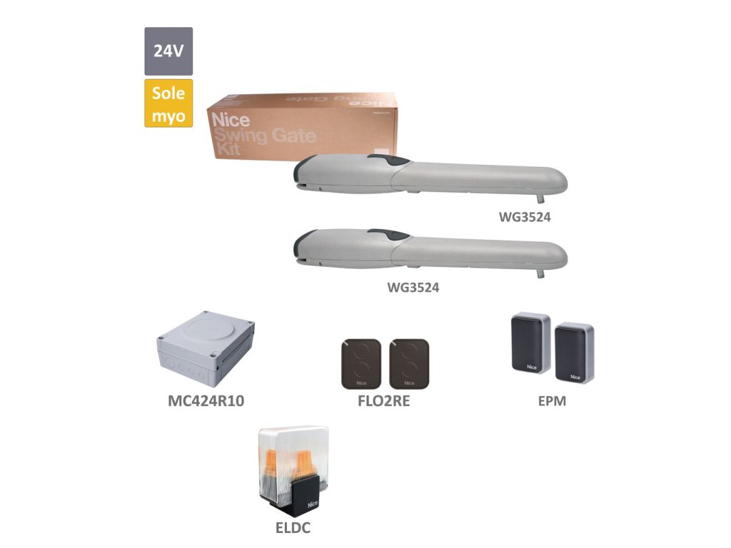 WINGO sada pro dvoukřídlou bránu do 3,5m/křídlo, 2x WG3524 (24V, 85W, 1500N), 2x FLO2RE, 1 pár EPM, 1x ELDC, 1x MC424R10 + vestavěný přijímač Vlastnosti: Spolehlivost a tichý chod: Patentované vnitřní uspořádání součástek a méně pohyblivých částí zaručuje spolehlivost a tichý chod pohonu. Jednoduchost montáže: Elektrické zapojení je možné realizovat shora po namontování pohonu. Pohodlné odblokování: Pohon je možné jednoduše odblokovat pomocí personalizovaného klíče Nice nebo standardního zámku. Předmontované mechanické dorazy: Zajišťují přesné zastavení brány v otevřené a zavřené poloze. Řídicí jednotka Moonclever MC424R10: Jednoduché programování pomocí tří tlačítek. Vstavaný přijímač pro dálkové ovládání. Výhody: Spolehlivost a tichý chod Jednoduchost montáže a údržby Pohodlné odblokování Vysoká úroveň bezpečnosti Rozšířené možnosti programování Možnost použití nouzové baterieDoplňkové parametry
