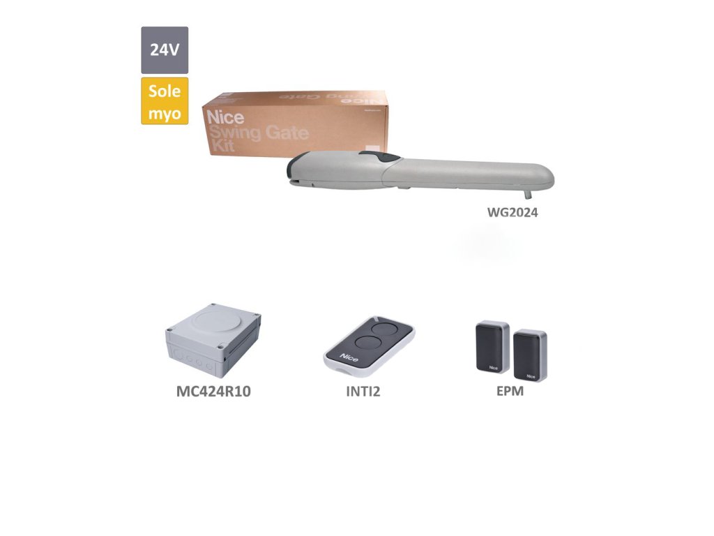 WINGO sada pro jednokřídlou bránu do 2m/křídlo, 1x WG2024, 1x MC424R10 + vestavěný přijímač, 1x INTI2, 1 pár EPM pro venkovní montáž. Elektromechanický motor 24 Vdc. Spolehlivost a tichost: patentované vnitřní uspořádání součástek, méně pohyblivých častí Jednoduchost montáže: Elektrické zapojení shora, po montáži pohonu Pohodlné odblokování personalizovaným klíčem Nice a standardním zámkem. Mechanické koncové dorazy při otevírání jsou předmontované. Řídicí jednotka Moonclever MC424R10: jednoduché programování jedním ze tří tlačítek; vestavěný přijímač spojka s pojistkou proti přivření; automatické načtení koncových poloh při otevírání a zavírání; programování délky pauzy; křídlo pro pěší; zpomalení během otevírání a zavírání; detekce překážek; možnost připojení bezpečnostní lišty 8,2 kΩ; fungování i během výpadku dodávky elektrické energie díky volitelné záložní baterii (PS124), zabudované přímo do krabice s jednotkou.Doplňkové parametry