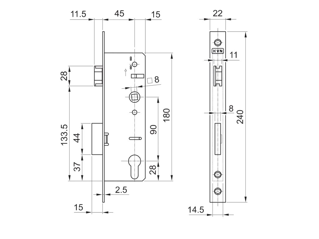 Zámek vložkový, hloubka 59 mm, rozteč 90 mm, poniklovaná přední lišta