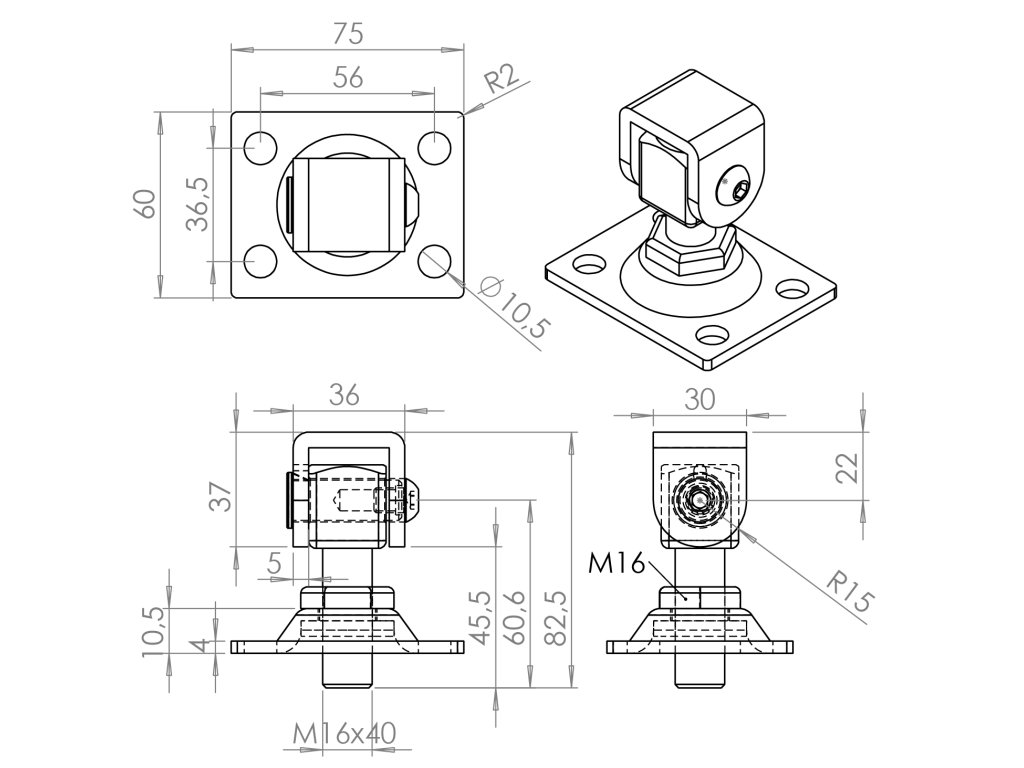 Pant M16 s plotnou 75 x 60 mm, otevíratelný 90°, nastavitelný 1D, částečně pozinkovaný